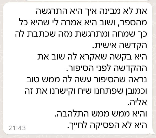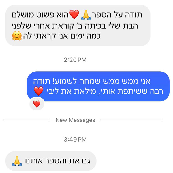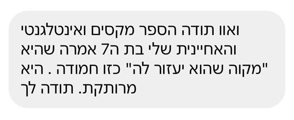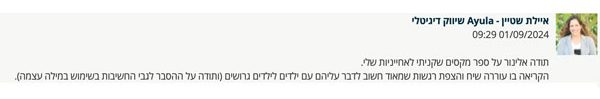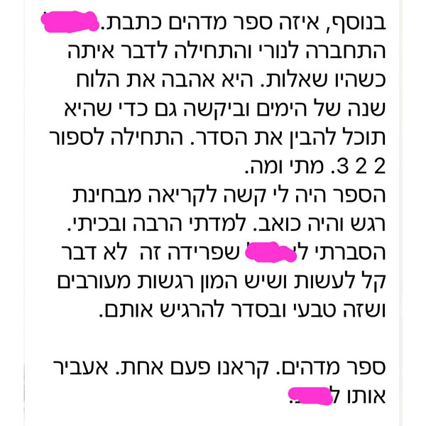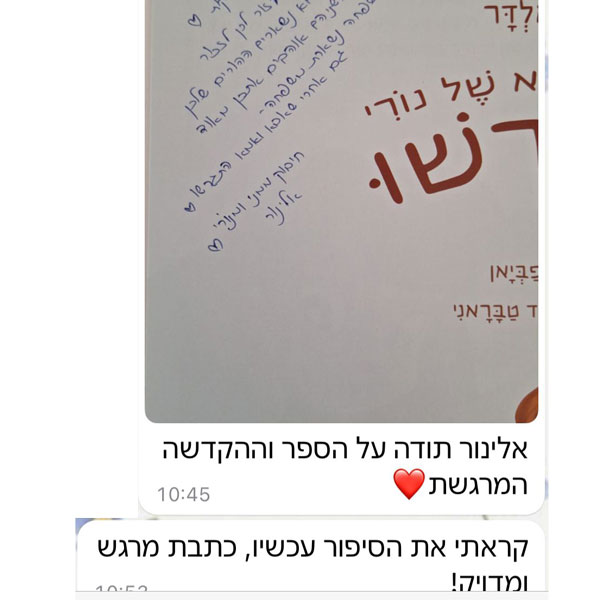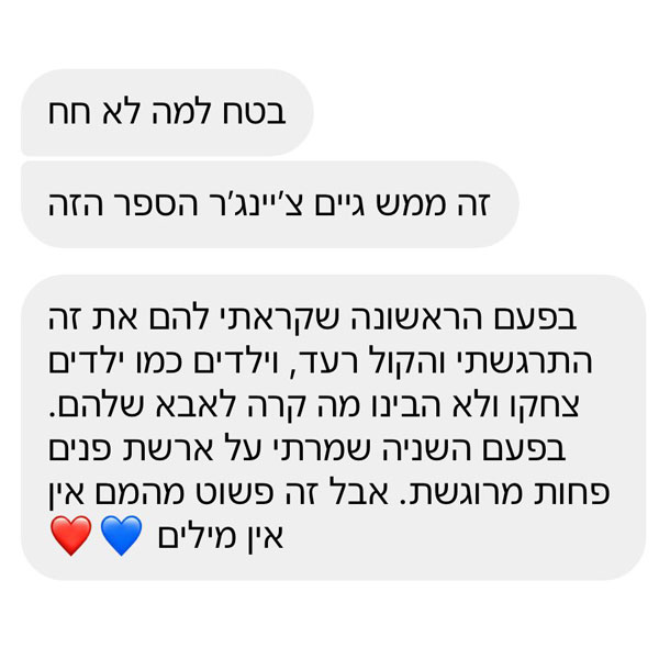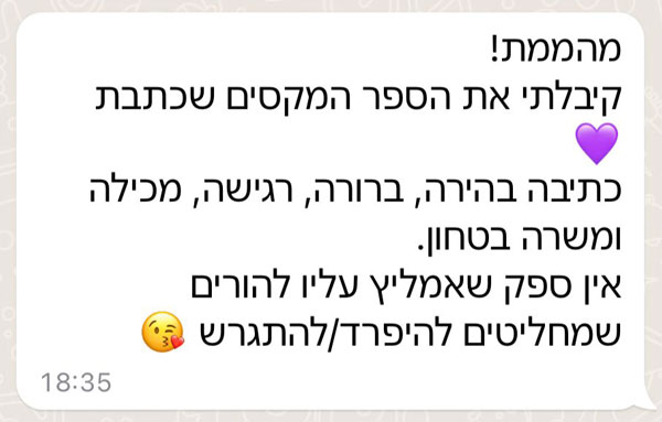 ״תודה אלינור על הספר שקניתי לאחיינית שלי. הקריאה בו עוררה שיח והצפת רגשות שמאוד חשוב לדבר עליהם עם ילדים להורים גרושים (ותודה על ההסבר לגבי החשיבות בשימוש במילה עצמה).״