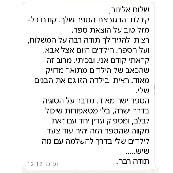 ״אלינור, ספר ילדים יפה, טוב, נוגע ונכון, הרגע סיימנו אותו מחכה לדבר עם הילדים שעוברים בדיוק את התהליך לא פשוט, תודה שאת משאירה להם לחוות? להבין?"